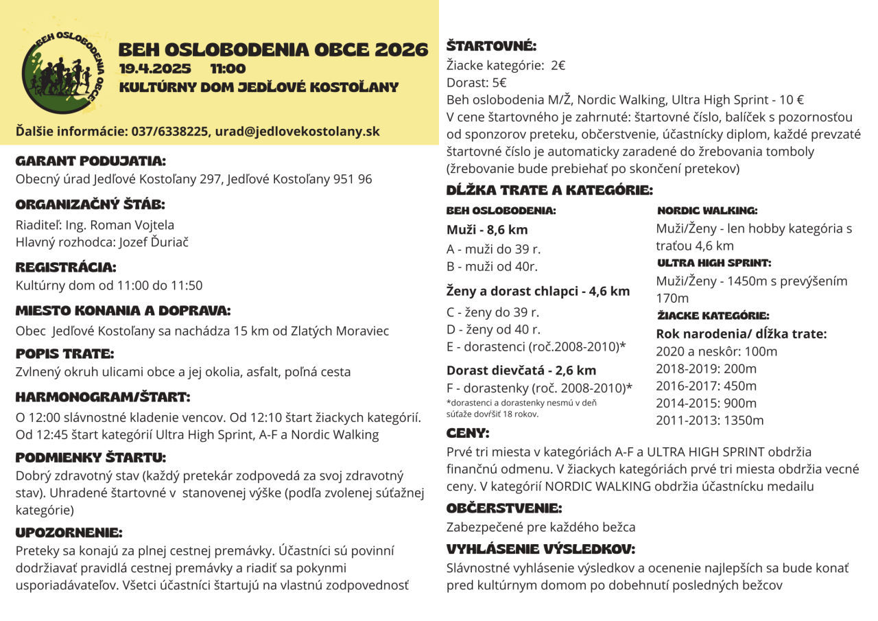 O 12:00 slávnostné kladenie vencov. Od 12:10 štart žiackych kategórií. Od 12:45 štart kategórií Ultra High Sprint, A-F a Nordic Walking